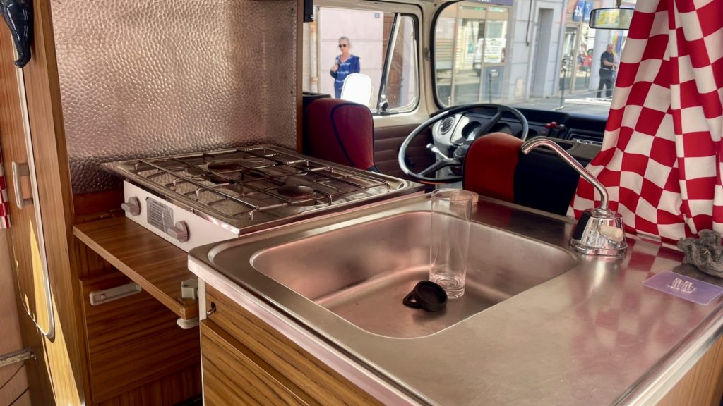 Côté extérieur, RUBY se distingue par sa carrosserie bicolore rouge et blanc crème, fraîchement repeinte dans la teinte originale Montana Red de Volkswagen, et ses jantes assorties. Le toit champignon relevable permet de se tenir debout à l’intérieur, offrant ainsi un véritable espace de vie, même à l’arrêt.