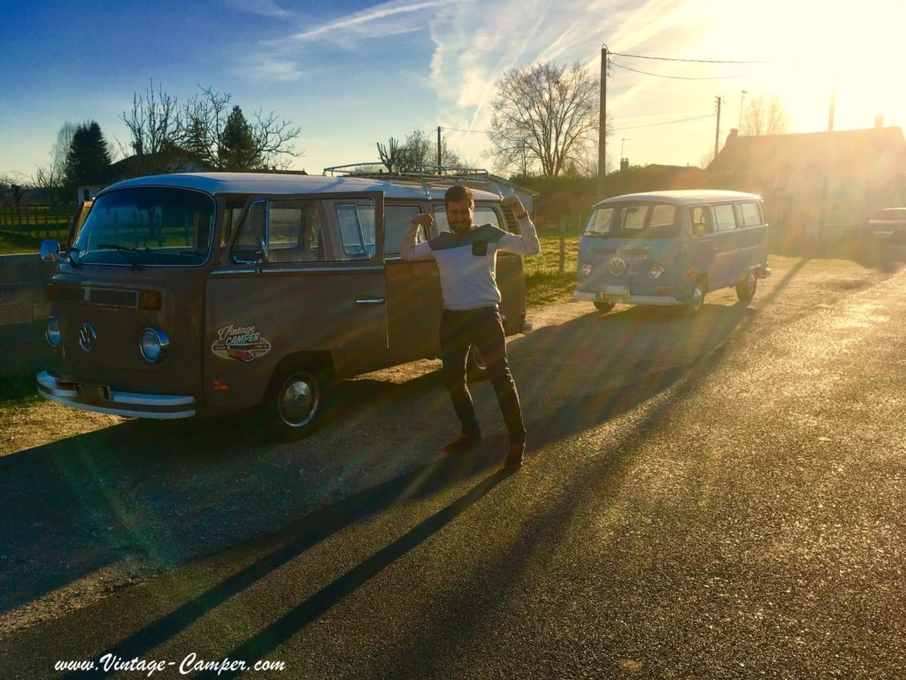Fabien n'a pas de voiture de collection en ce moment du coup il nous a loué un combi volkswagen minibus…