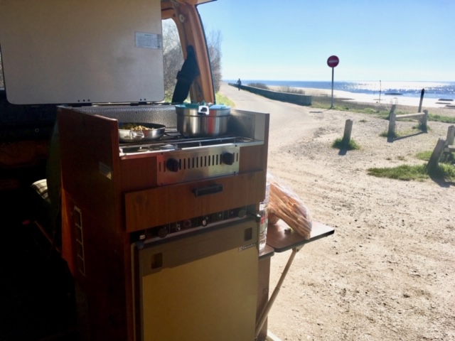 Grâce au combi volkswagen,vous pourrez cuisiner dehors et n'importe ou comme ici avec vue sur le bassin d'Arcachon!