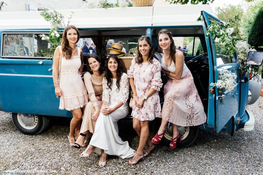 Les demoiselles d'honneur posent fièrement devant le combi VW l