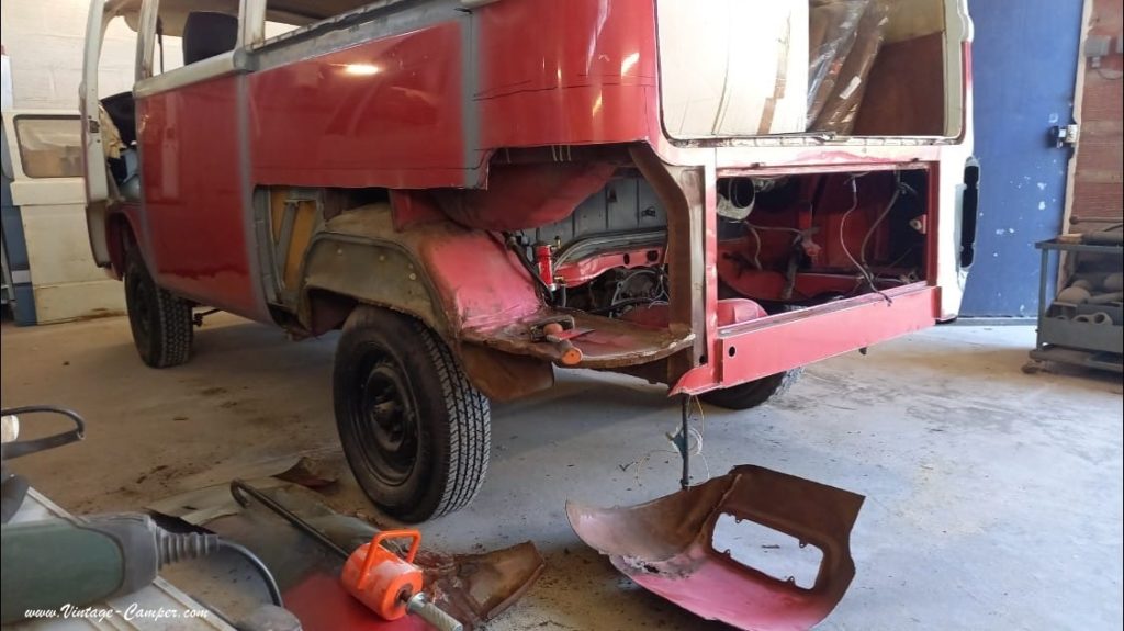 Quelques nouvelles de notre combi minibus "Tomato Fiesta" qui est tjrs en cours de restauration... découpage de l'aile arrière gauche…
