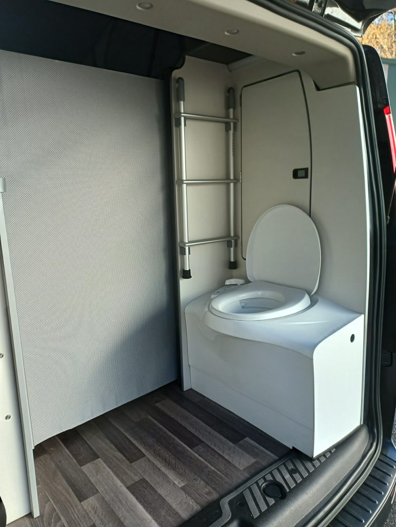 – le + du nugget « PLUS » : de véritables toilettes chimiques à l’arrière du van, avec un petit lavabo et avec une cloison amovible pour plus d’intimité !